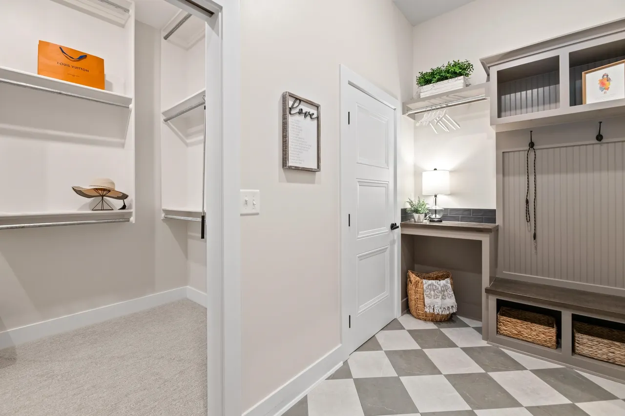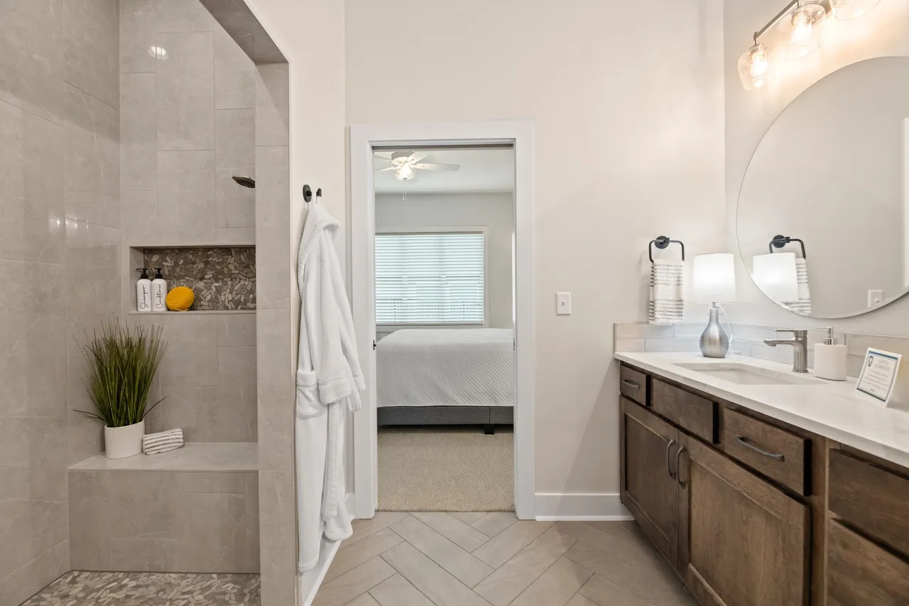 master suite’s elegance, complete with double vanity, fully tiled walk-in shower with a bench seat, separate water closet, and a large